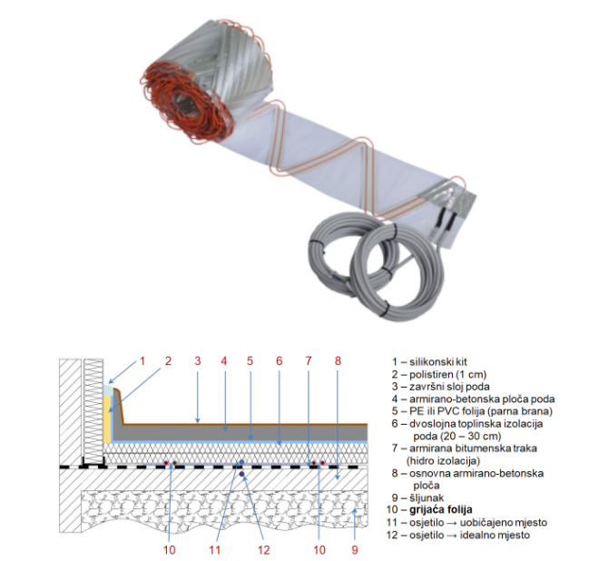 1 – silicone putty, 2 – polystyrene (1cm), 3 – the final layer of the floor , 4 – reinforced concrete floor slab 5 – PE or PVC foil (steam dam), 6 – two-layer thermal insulation of the floor (20-30cm), 7 – reinforced bitumen tape (waterproofing), 8 – basic reinforced concrete slab,, 9 – gravel 10 – heating foil, 11 – thermostat sensor (common place) 12 – thermostat sensor (ideal place)