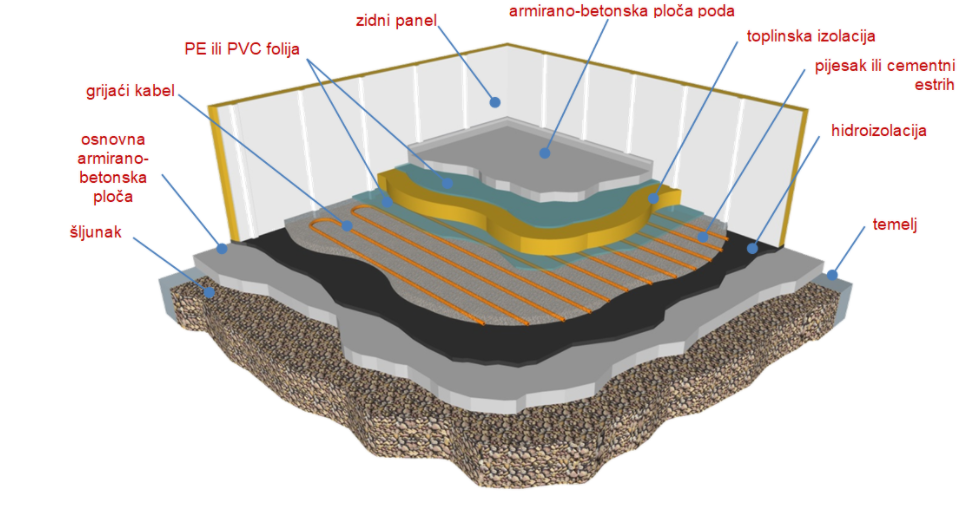 Heating cables are installed on the waterproofing of the basic reinforced concrete slab of the cooling chamber. They are covered with a layer of sand or cement screed, followed by thermal insulation of the floor, PE or PVC foil and a load-bearing reinforced concrete floor slab. Due to the impossibility of subsequent interventions and possible repairs of the heating cables (when the cooling chamber is already working), in addition to WORKING heating cables, SPARE heating cables are always installed in the floor.