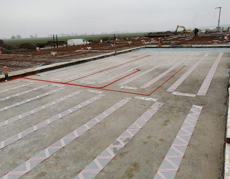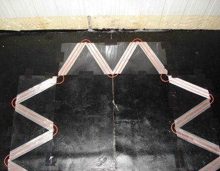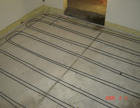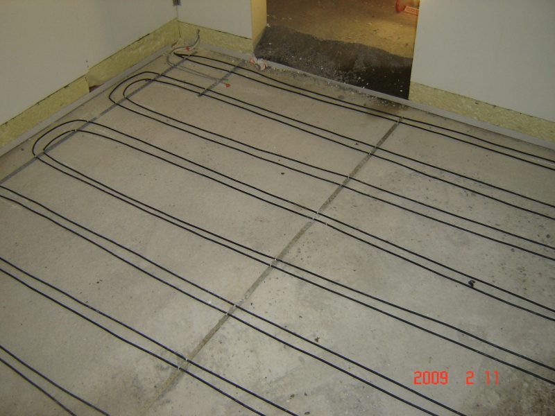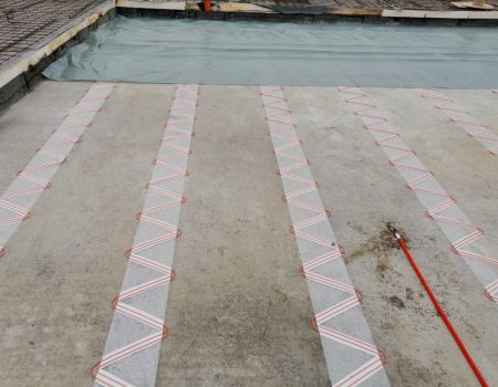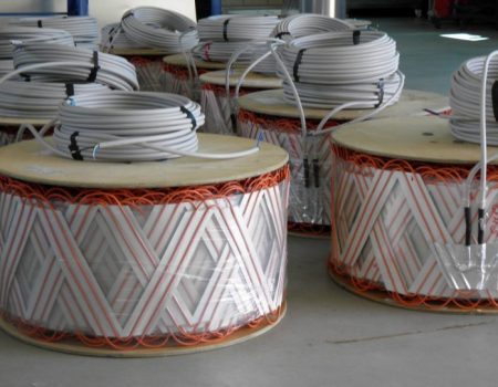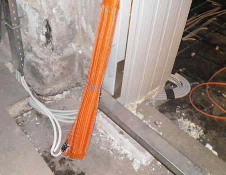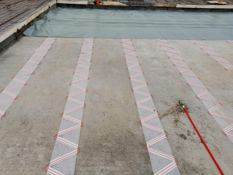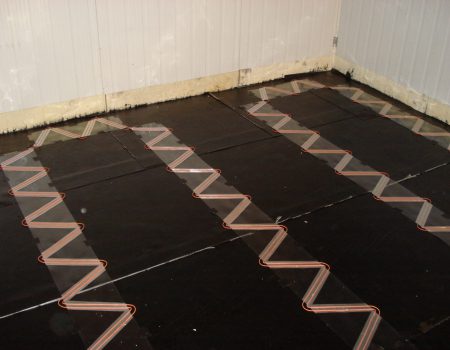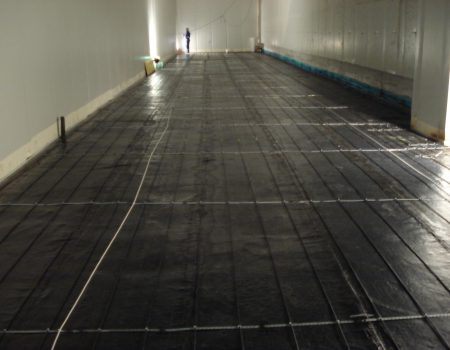 Heating cables are installed on the waterproofing of the basic reinforced concrete slab of the cooling chamber. They are covered with a layer of sand or cement screed, followed by thermal insulation of the floor, PE or PVC foil and a load-bearing reinforced concrete floor slab. Due to the impossibility of subsequent interventions and possible repairs of the heating cables (when the cooling chamber is already working), in addition to WORKING heating cables, SPARE heating cables are always installed in the floor.