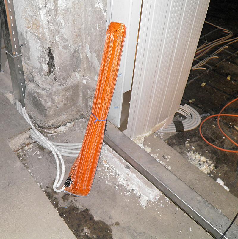 To protect the threshold, door and the area around the door from sticking and ice formation, heating tracks of the cooling chamber threshold (GTPH) or thin heating mats for cooling chamber (TGMtH) are installed in the concrete floor layer 3 to 5 cm from the top of the finished floor. Heating tracks have a unit power of 340 W/m², while heating mats have a unit power of 300 W/m².